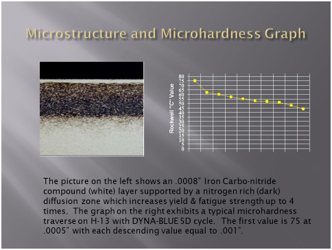 The microstructure of a Ferritic Nitrocarburized treated sample consists of a hard (75+ HRC) compound zone of carbon and nitrogen with a nitrogen rich diffusion zone beneath for support. The hard compound layer increases wear and corrosion resistance, has high compressive residual stress to resist wear, heat checking and cracking. When combined with an oxide layer on the surface it prevents atomic bonding of aluminum, plastic, etc. and reduces the coefficient of friction.