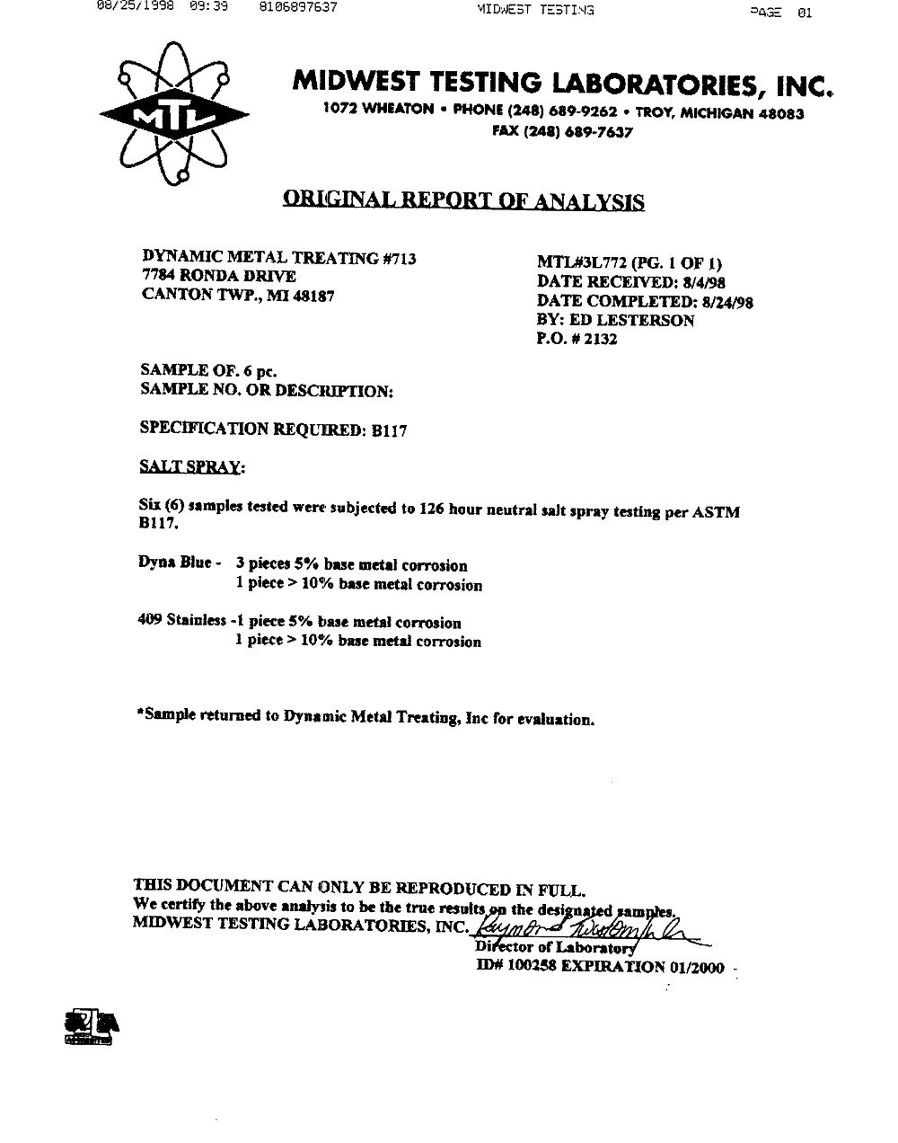 Salt Spray DYNA-BLUE vs Stainless Steel